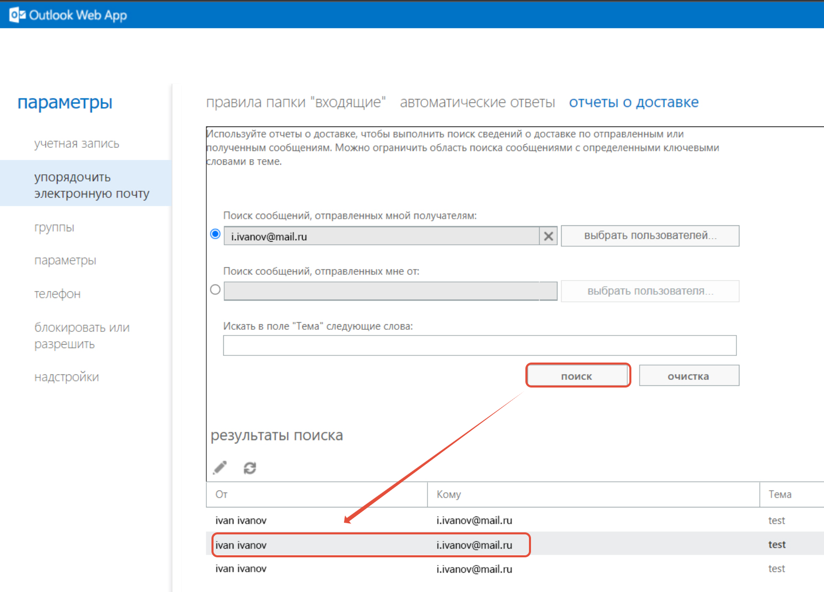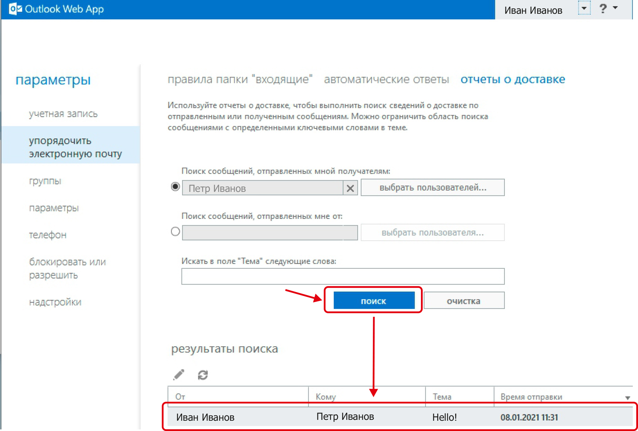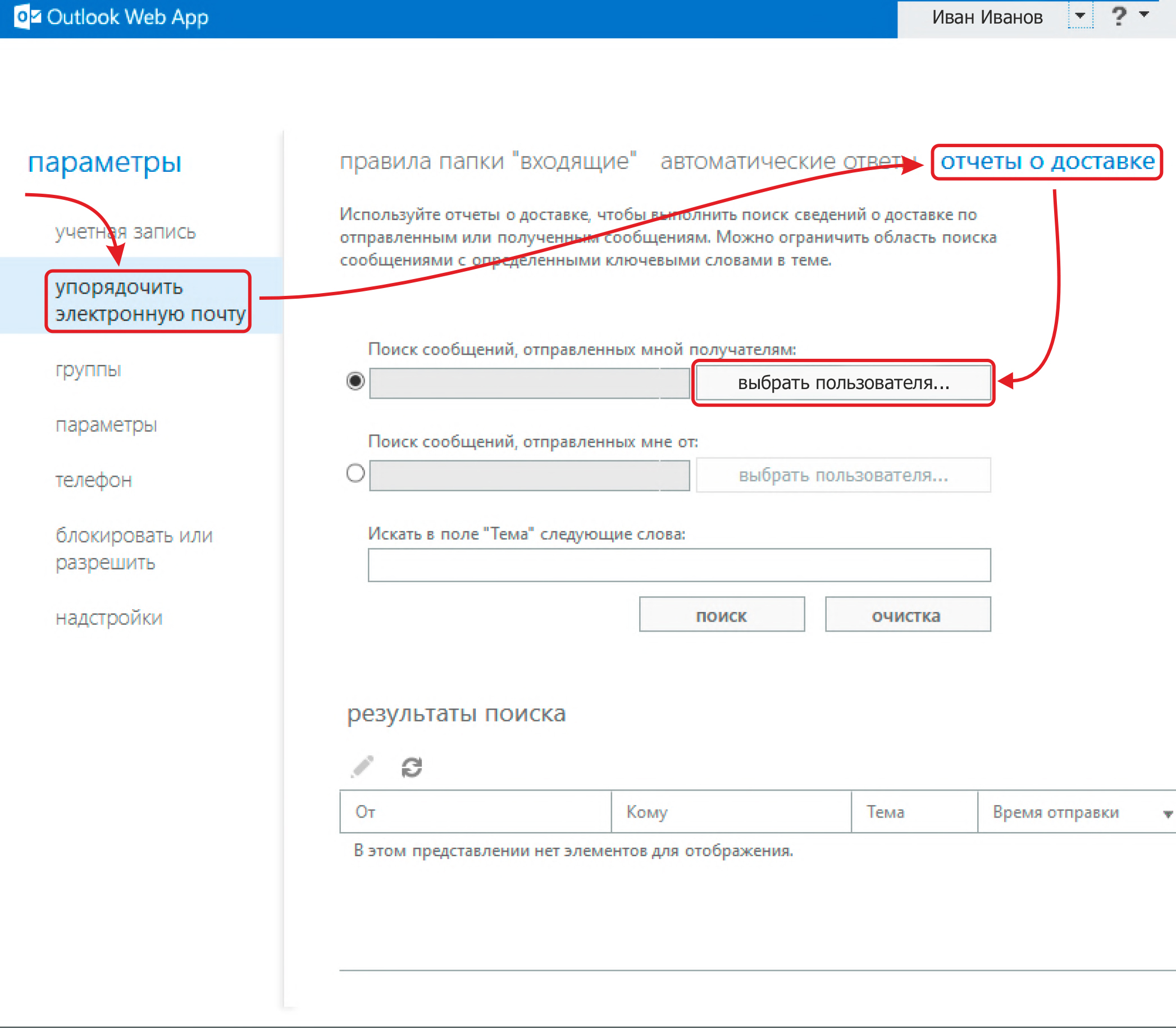 Слева в области Параметры перейдите в меню Упорядочить электронную почту и выберите Отчет о доставке