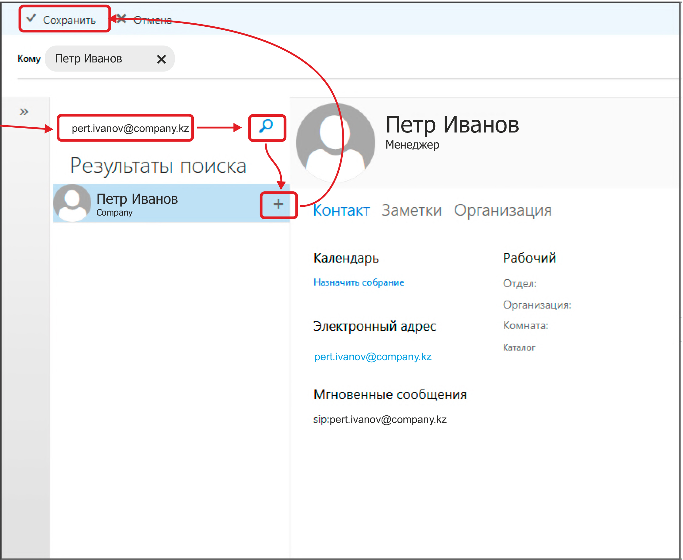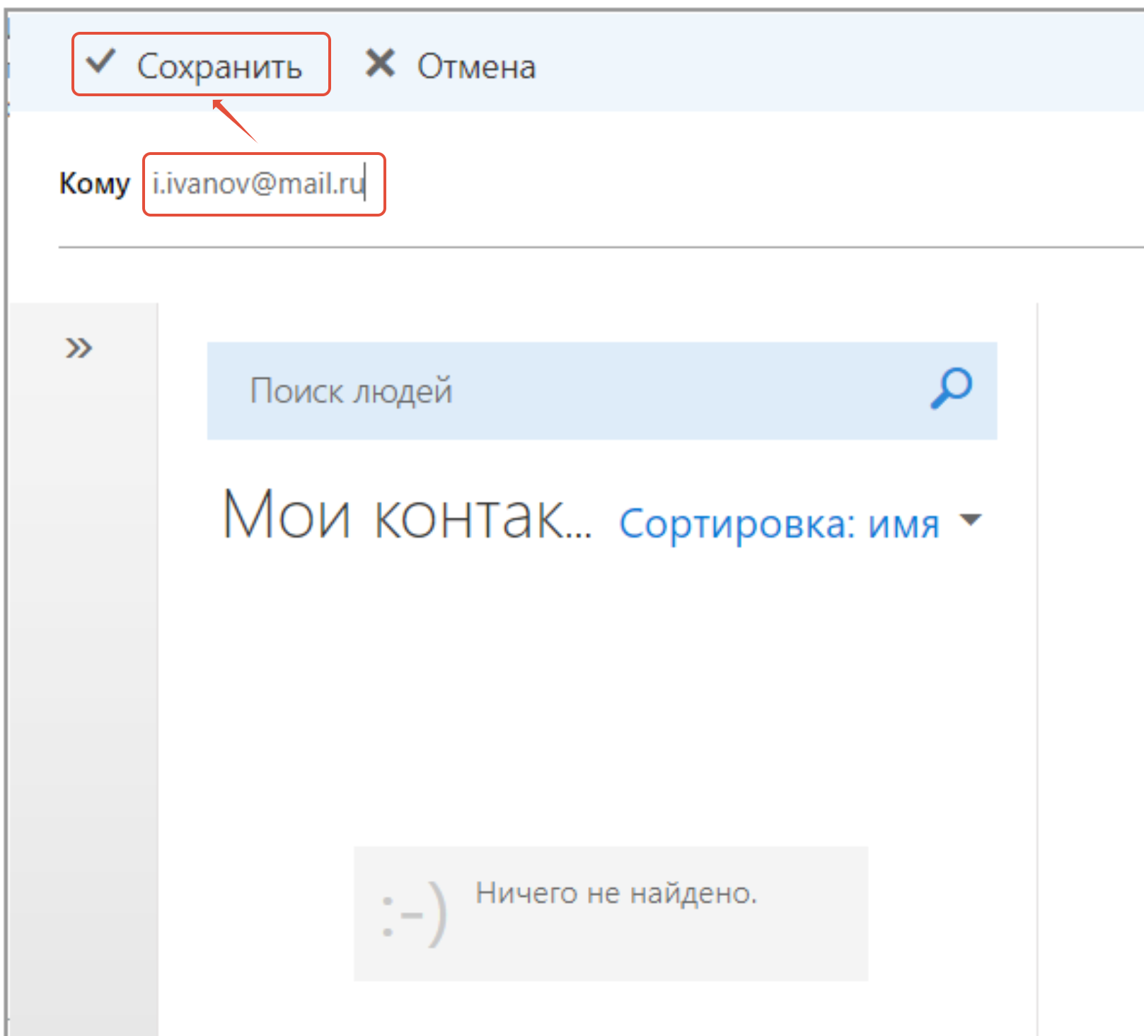В окне поиска контактов произведите поиск интересующего почтового контакта и сохраните результат поиска