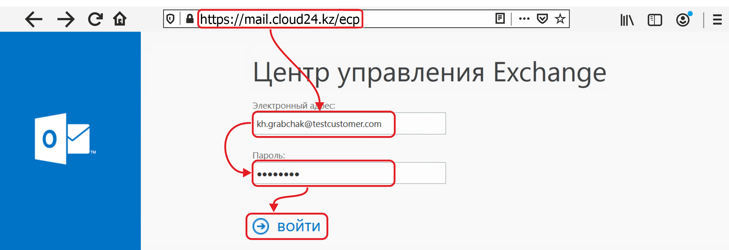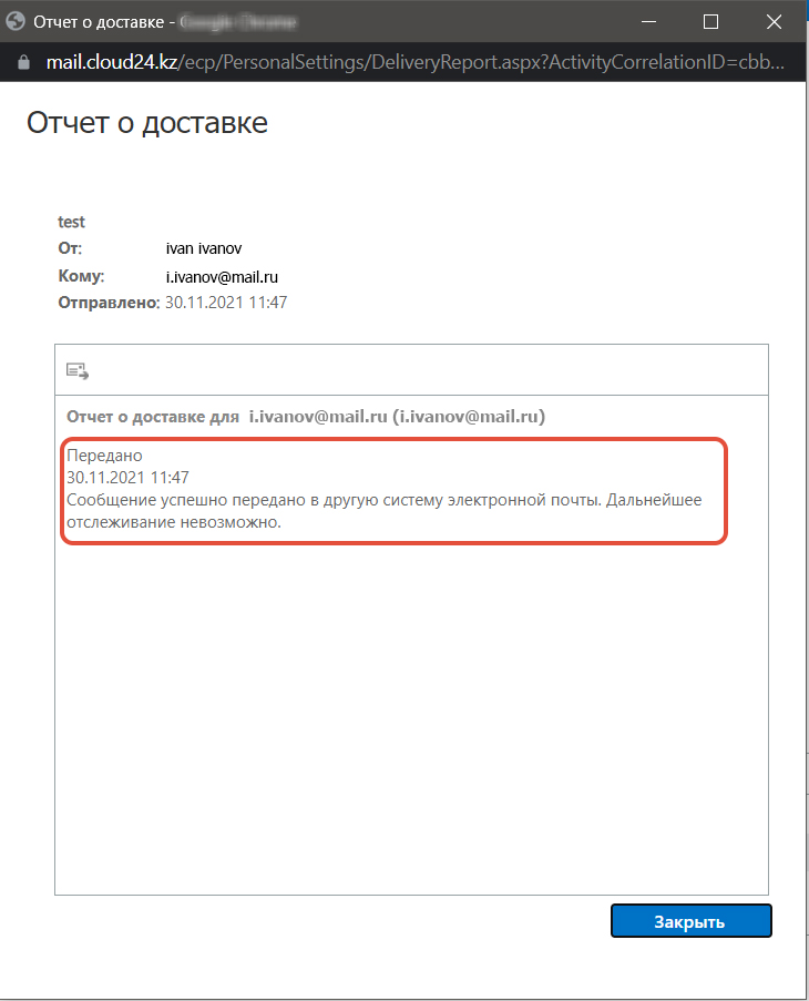 Для просмотра отчета о доставке перейдите по адресу https://mail.cloud24.kz/ecp/ в появившемся окне аутентификации введите свой логин и пароль.