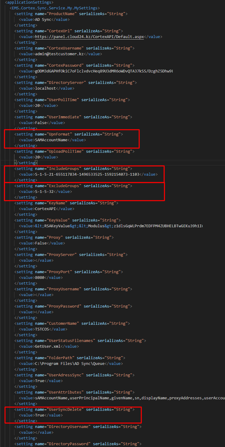 В файле C:\Program Files\AD Sync\ADSync.exe.config найдите строки с конфигурациями, указанные в Таблице настроек приложения, и вносить изменения заключенное в тег <value>...</value>