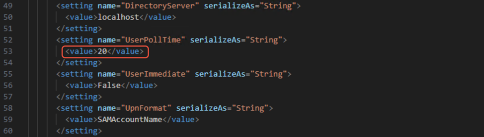 Например, искать можно по имени "UserPollTime" и изменить заключенное в тег <value>5</value> на <value>20</value>