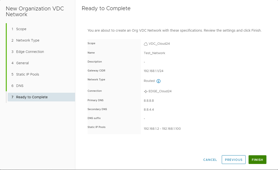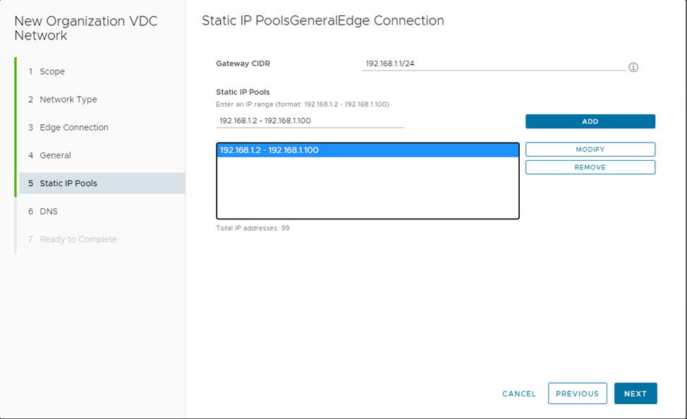 Во вкладке Static IP Pools можно выбрать диапазон адресов, которые статически будут выдаваться созданным виртуальным машинам, например 192.168.1.2-192.168.1.100 и нажать ADD, далее NEXT :