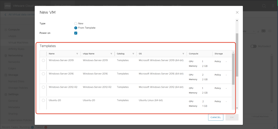 Выбираете шаблон виртуальной машины из списка доступных шаблонов: