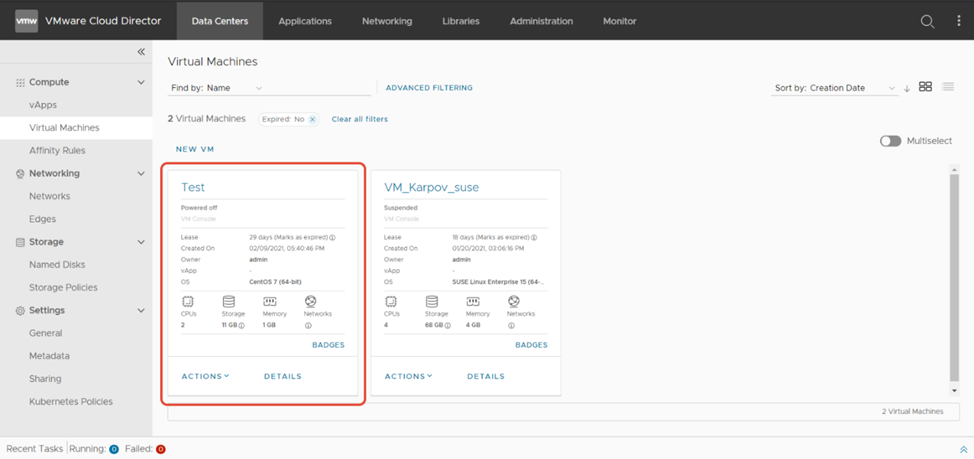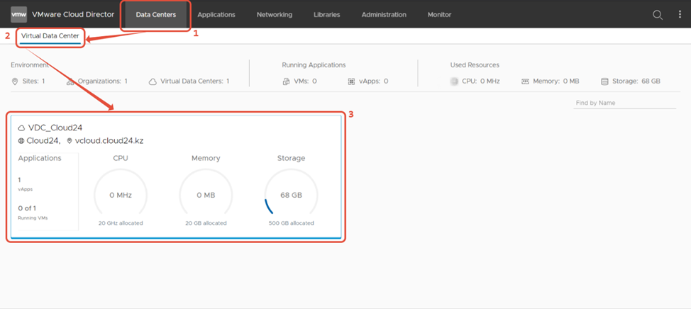 Чтобы создать автономную виртуальную машину, выберите вкладку Data Center, затем на экране Virtual Data Center щелкните карточку виртуального центра обработки данных.