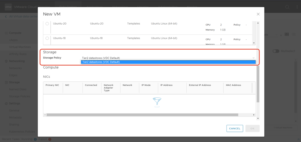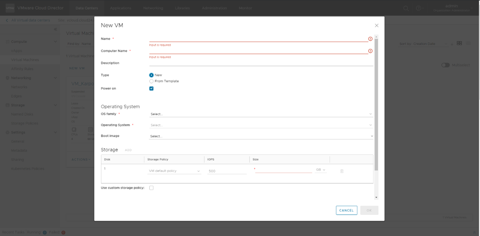 Storage - Укажите параметры хранилища для виртуальной машины, политику хранилища и размер в гигабайтах (GB):