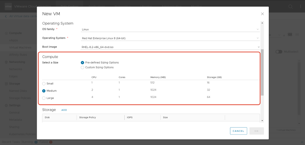 Pre-defined Sizing Options - предварительно определённые параметры размера ВМ: