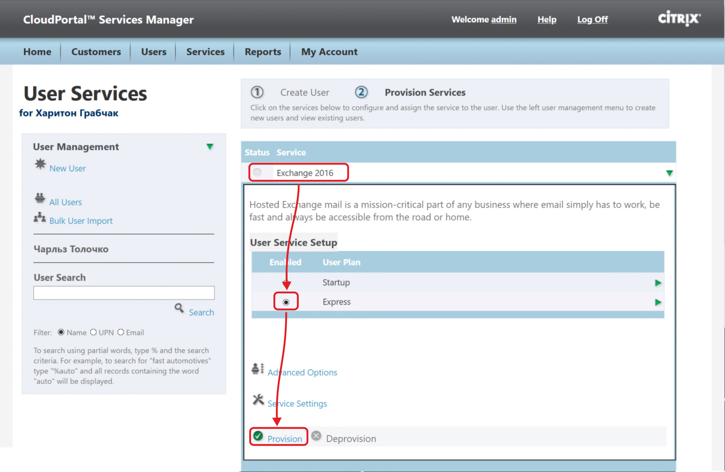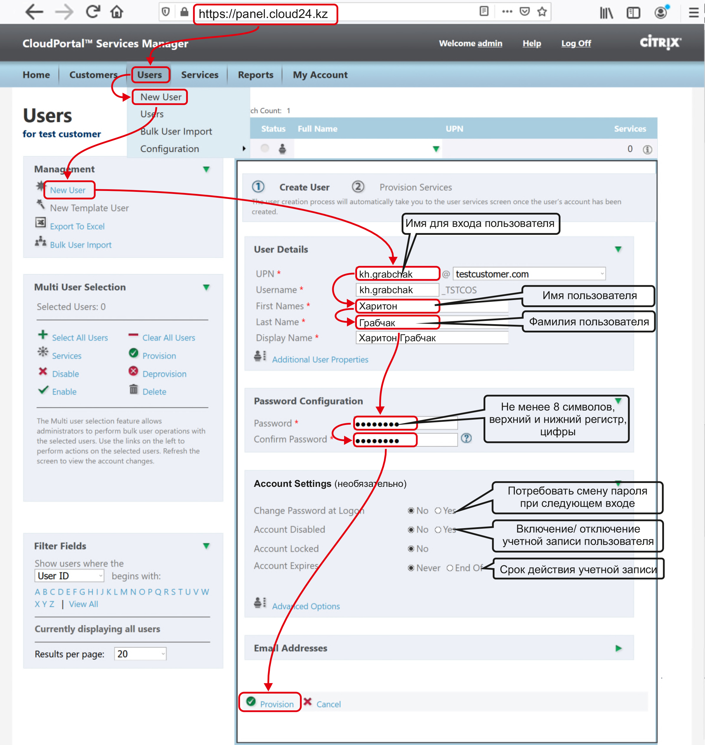 Создание новых учетных записей пользователей в панели CloudPortal Services Manager